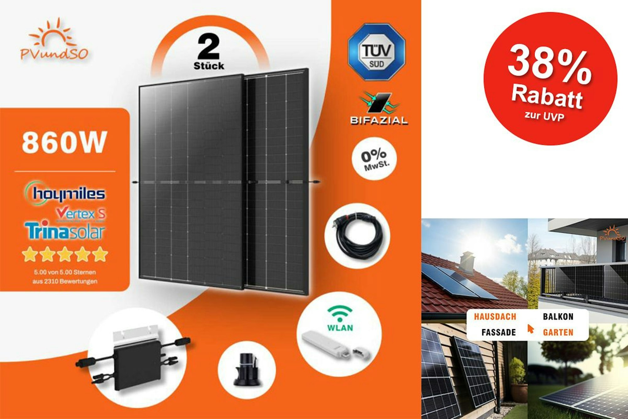 Derzeit kannst du dir im PVundSO Onlineshop* ein besonderes Angebot sichern, bei dem du 38% auf das 860W Bifaziale Balkonkraftwerk sparen kannst. Schnell sein lohnt sich, denn das Angebot ist befristet! Also schlag zu und hol dir dein Balkonkraftwerk für nur 299,00 €!