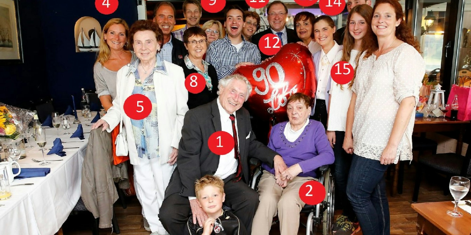 Der gesamte Sebus-Clan auf einer Feier: 1 Familienoberhaupt Ludwig Sebus 2 Ehefrau Lilo 3 Enkel und Geburtstagskind Jannis Derow 4 Tochter Jeannette 5 Schwester Hella Heckhausen 6 Schwiegersohn in spe Markus Wemmer 7 Schwiegersohn Jörg Derow 8 Tochter Monika Rück 9 Pflegekraft Inge Hellwig 10 Enkel Alexander Sebus 11 Nichte Ingrid Heckhausen 12 Sohn Michael Sebus 13 Schwiegertochter Monika Sebus 14 Enkelin Marie-Kristin Schnitzler 15 Neffe Wolfgang Heckhausen 16 Enkelin Luica Derow 17 Tochter und Jubilarin Nummer drei: Ulla Sebus-Derow.