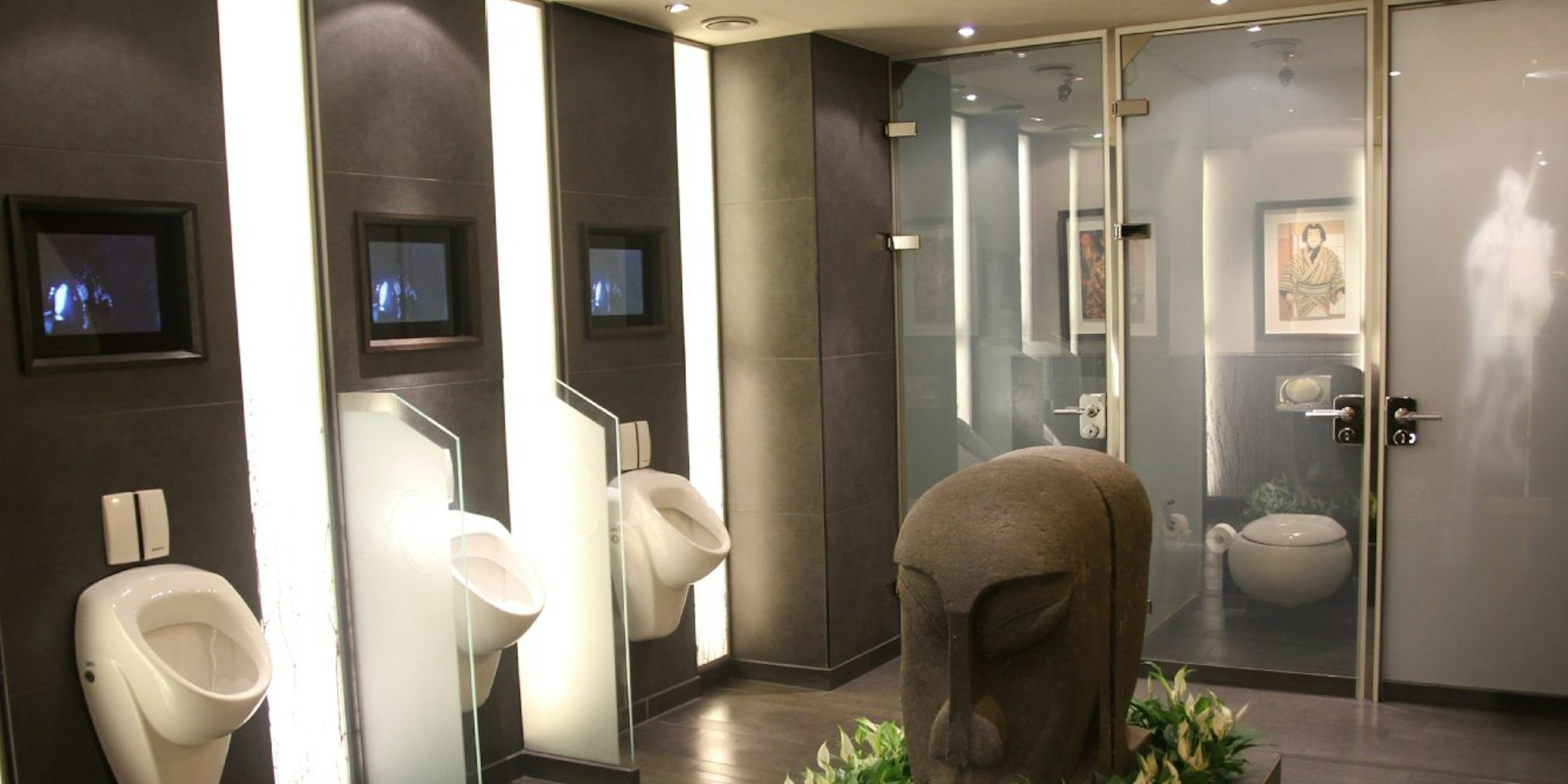 Das Touristischste: Herren, die sich in der 12. Etage des Hotel Pullmann Cologne erleichtern, können währenddessen die Aussicht auf den Doms genießen.