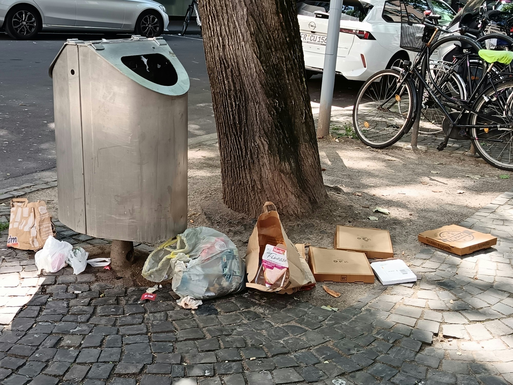 Pizzakartons und Abfall liegen neben einer Mülltonne in der Kölner Innenstadt.