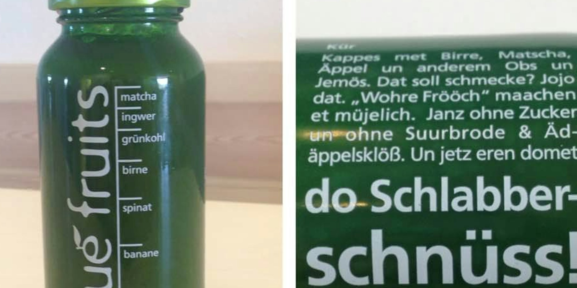 Köln/Bonn – „Kappes met Birre, Matscha, Äppel und anderem Obs un Jemös“: Was sich wie die Karte in einem kölschen Brauhaus anhört, ziert momentan die Flasche des „green smoothie no.1“ von „true fruits“. Der Bonner Saftladen hat es mal wieder geschafft, mit einem lustigen Spruch zu punkten und schickt et kölsche Jeföhl durch ganz Deutschland.