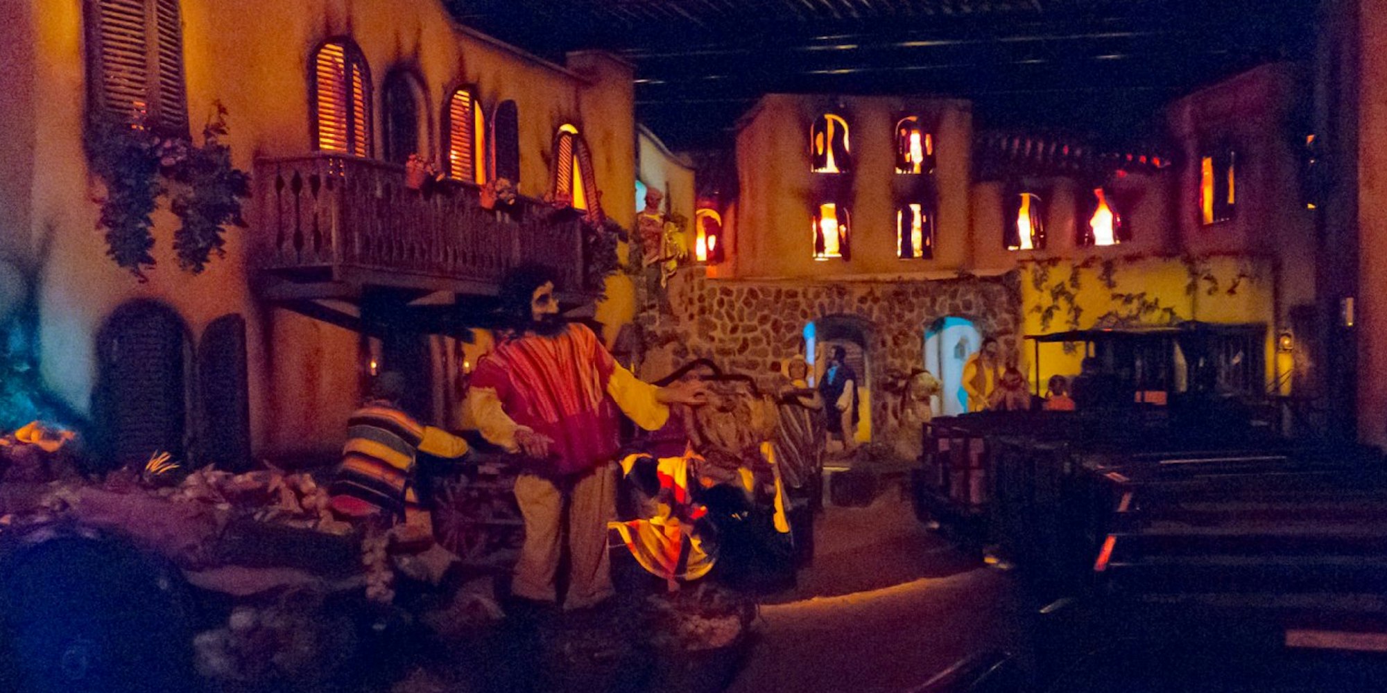 Die kultige Silbermine im Phantasialand ist Geschichte. Früher fuhr man hier in einem Zug zum Beispiel an dieser Szene mit brennenden Häusern vorbei.
