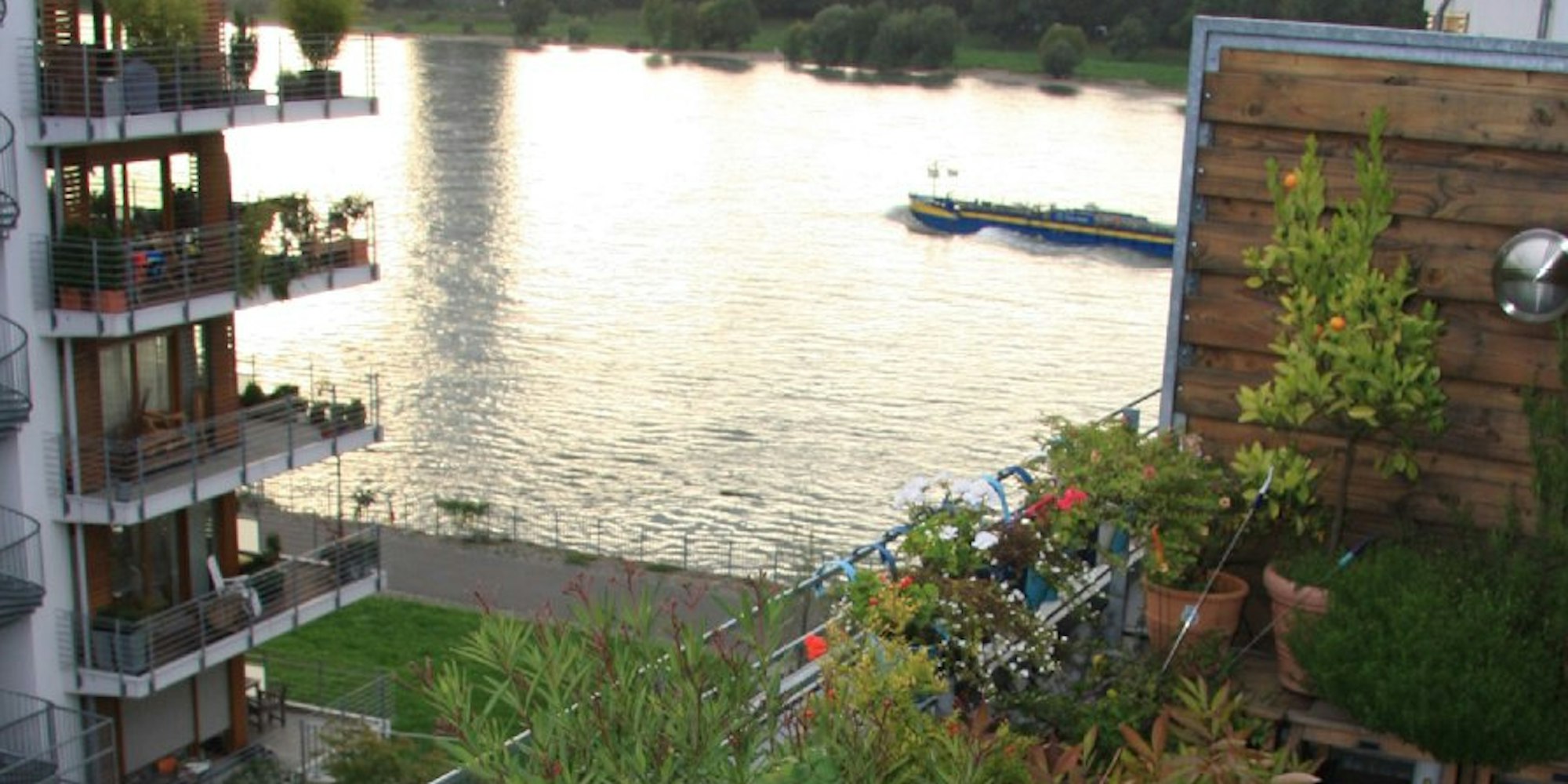 Dagmar Bolzhausen (54) genießt die Aussicht von ihrem Balkon in der vierten Etage. Die Sonne geht gerade unter, ein Tanker zieht vorbei. Sie lächelt: „Ich liebe den Rhein.“ Momentan wohnt sie noch im Agnesviertel, vermietet die 67,5 Quadratmeter als Ferienwohnung an Messegäste und Familien mit Kindern. Wenn sie in Rente geht, wird sie selbst dort leben. Sie freut sich schon darauf.