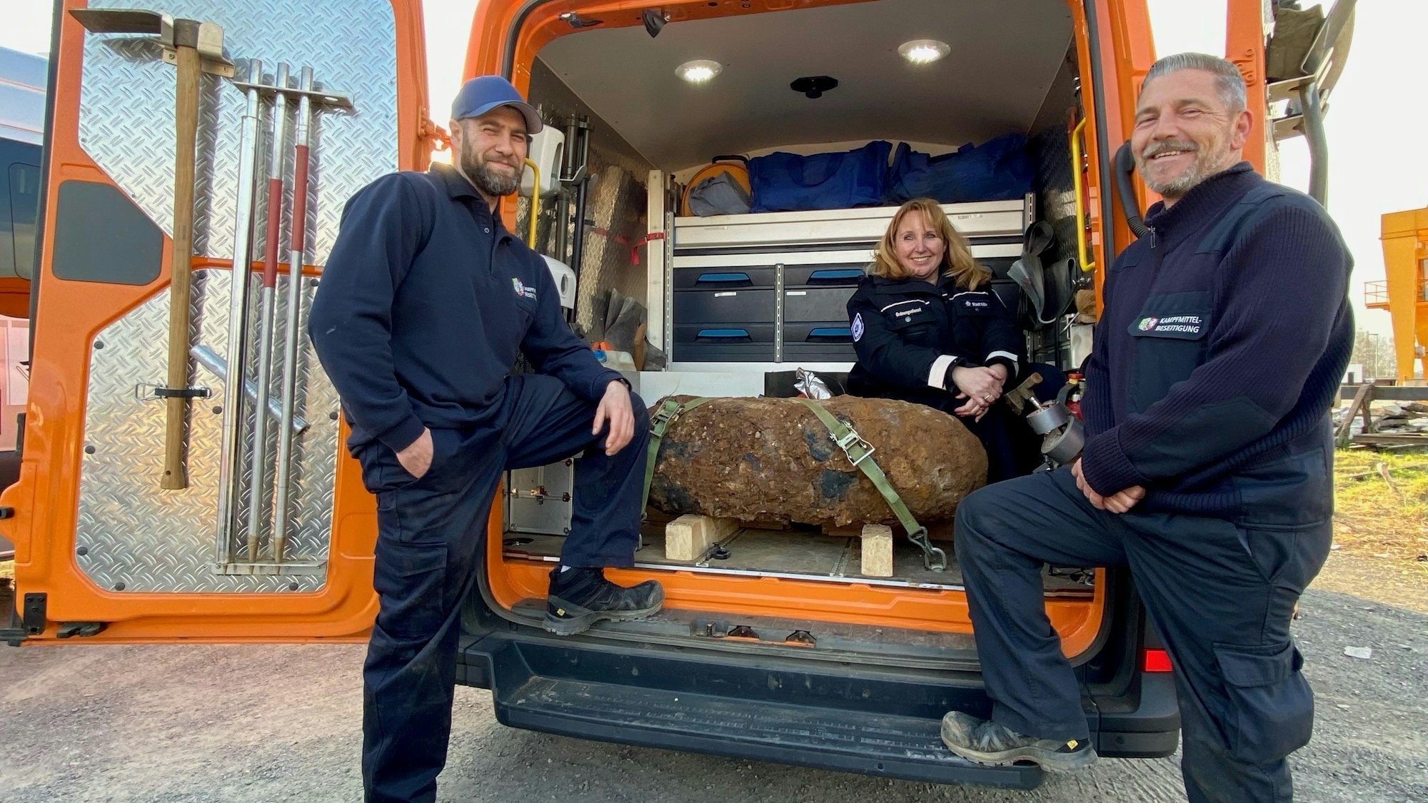 Die Entschärfer des Kampfmittelbeseitigungsdienstes Rheinland der Bezirksregierung Düsseldorf (KBD) mit der unschädlich gemachten Bombe: Michael Hilgers (links) und Marcel Biewald (rechts) mit Petra Rothe (Einsatzleiterin des Ordnungsamts der Stadt Köln)