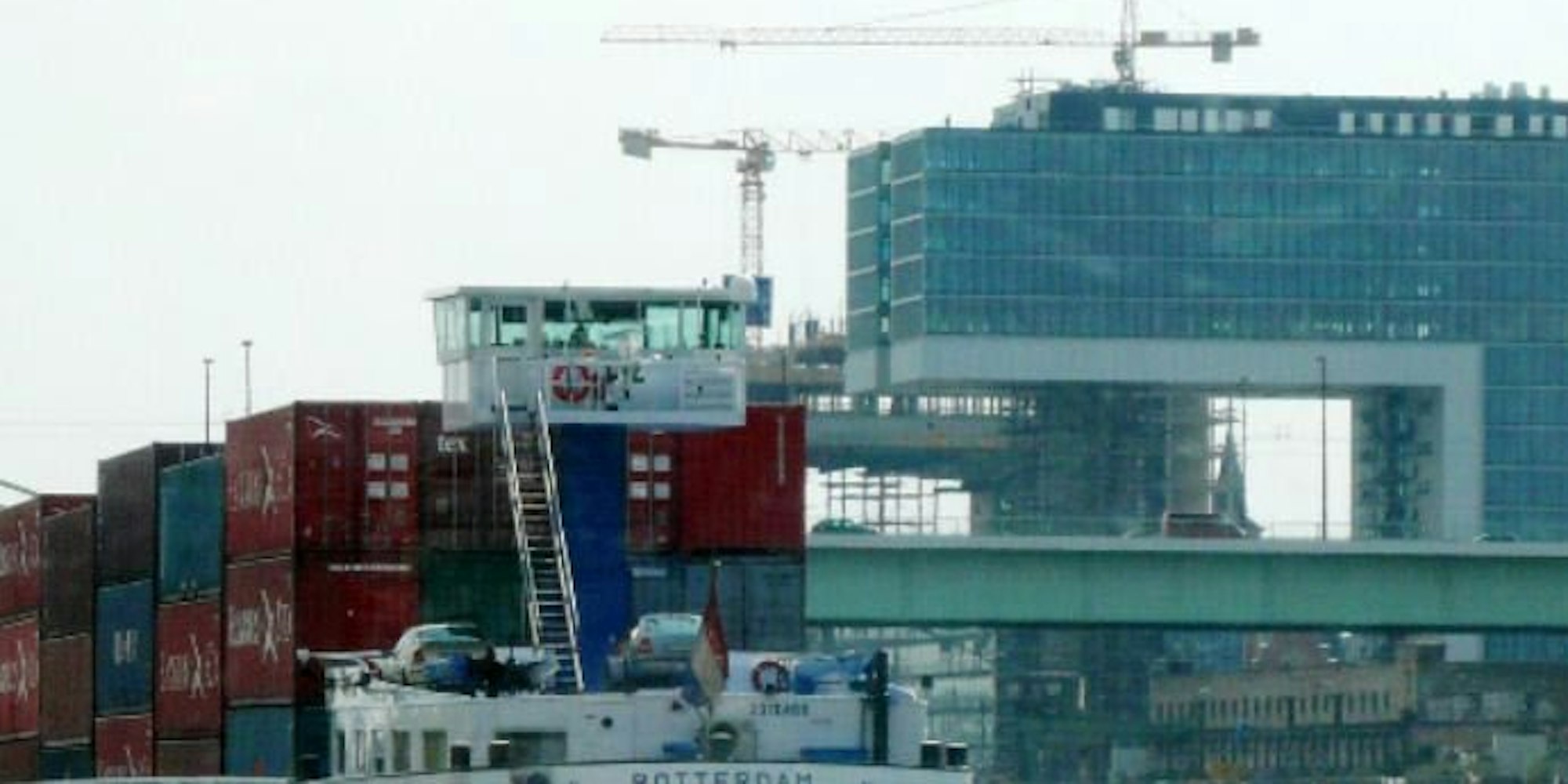 Der voll beladene Frachter vorm Rheinauhafen symbolisiert: Die Logistik- und Baubranche brummt.