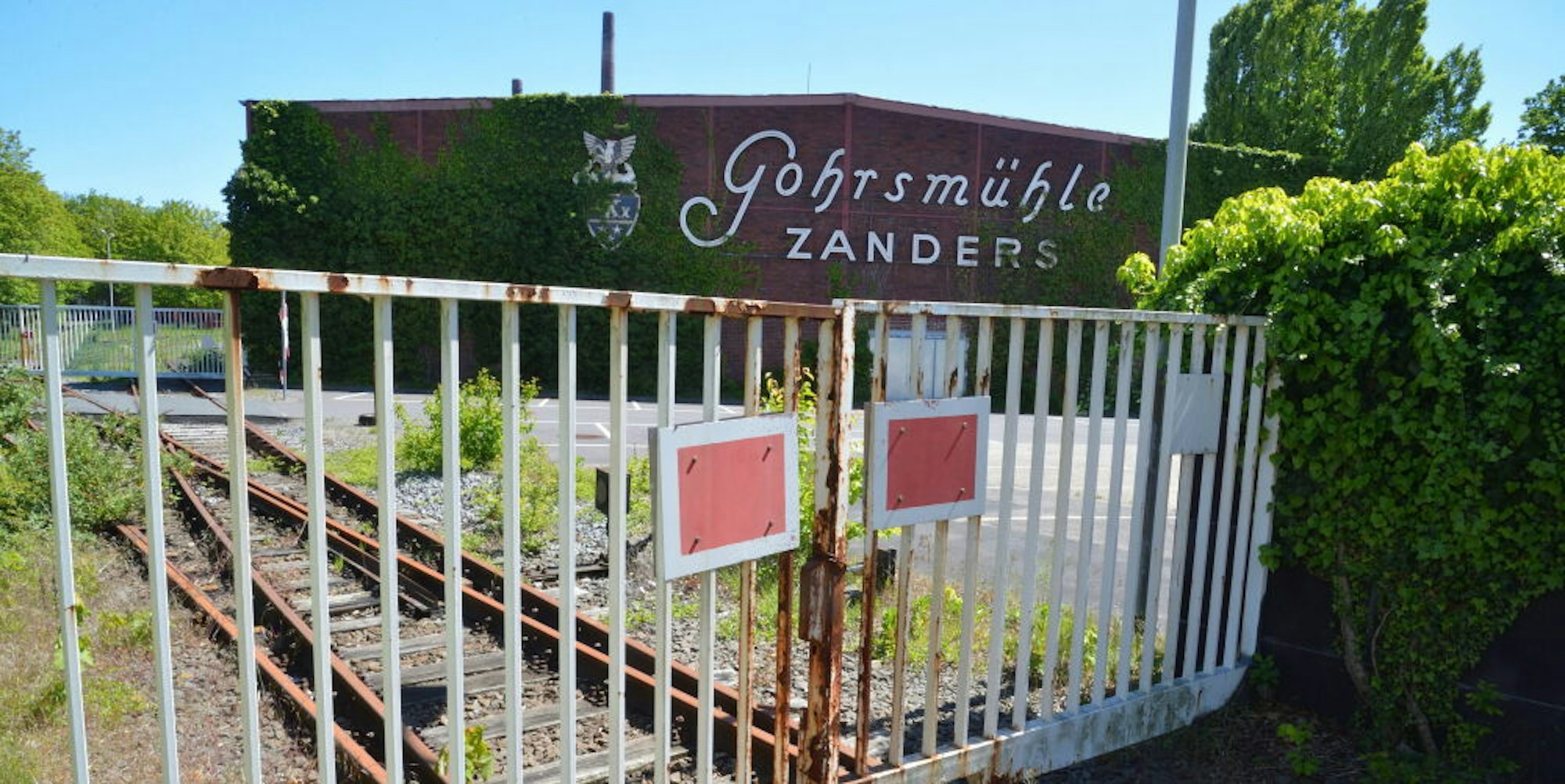 Die Papierfabrik Zanders in Bergisch Gladbach stellt den Betrieb ein. Hier das Tor, durch das früher die Kohle fürs Kraftwerk per Bahn geliefert wurde.
