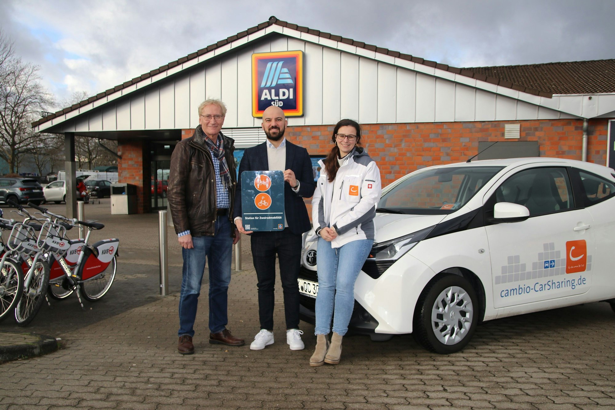 ALDI-Kunden und Anwohner können Bikes der KVB und Carsharing-Wagen von cambio komfortabel nutzen