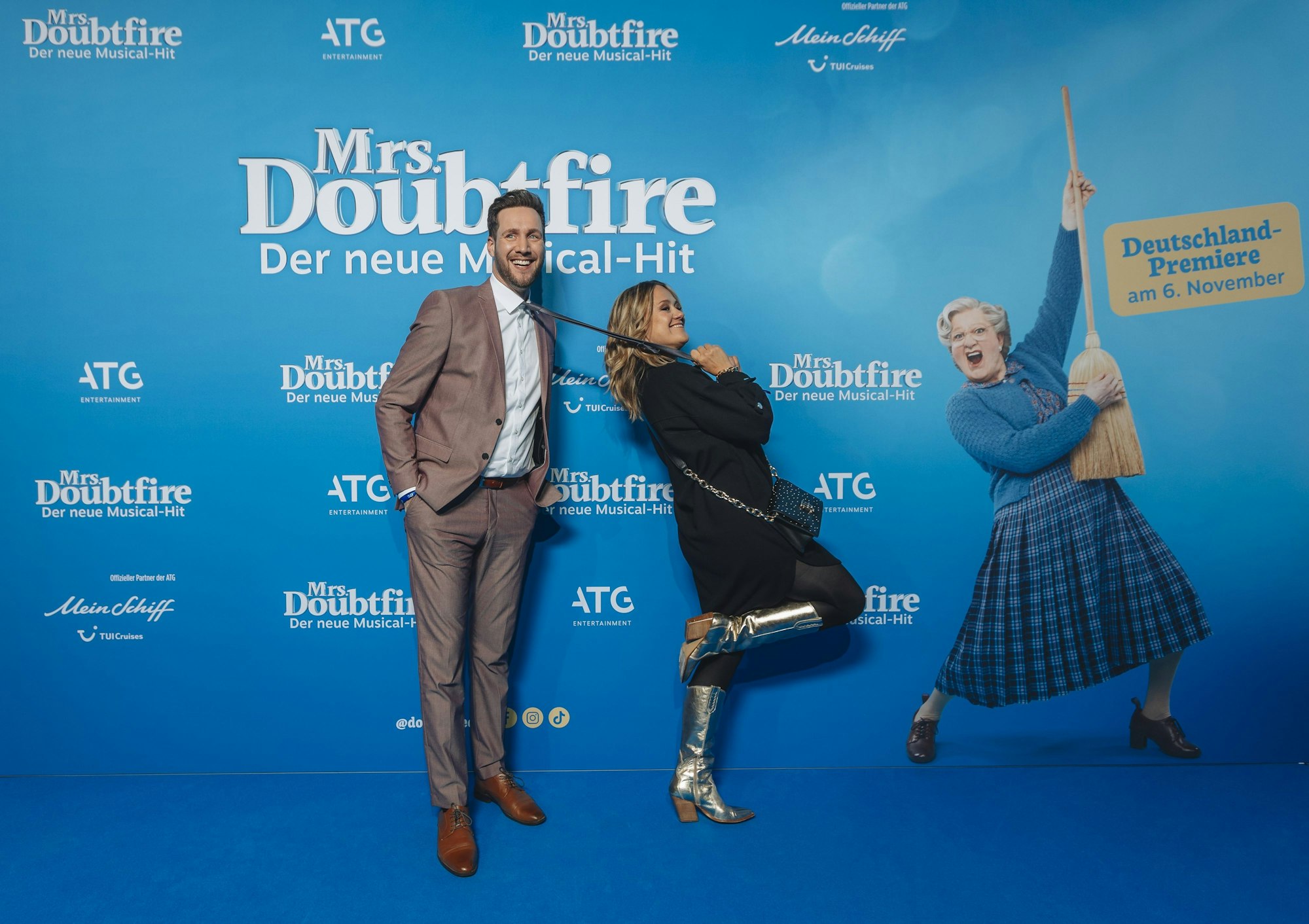 Moderatorin und Model Rebecca Mir: „Mrs. Doubtfire ist einer unserer Lieblingsfilme! Das Musical ist super, die Darsteller und die Choreografie – großartig.“ Massimo Sinató: „Ein ganz großes Kompliment an das Ensemble. Es ist total schön umgesetzt. Der Mrs. Doubtfire-Darsteller macht das großartig. Ich weiß ja selbst, wie schwierig das ist, eine Rolle einzustudieren.“