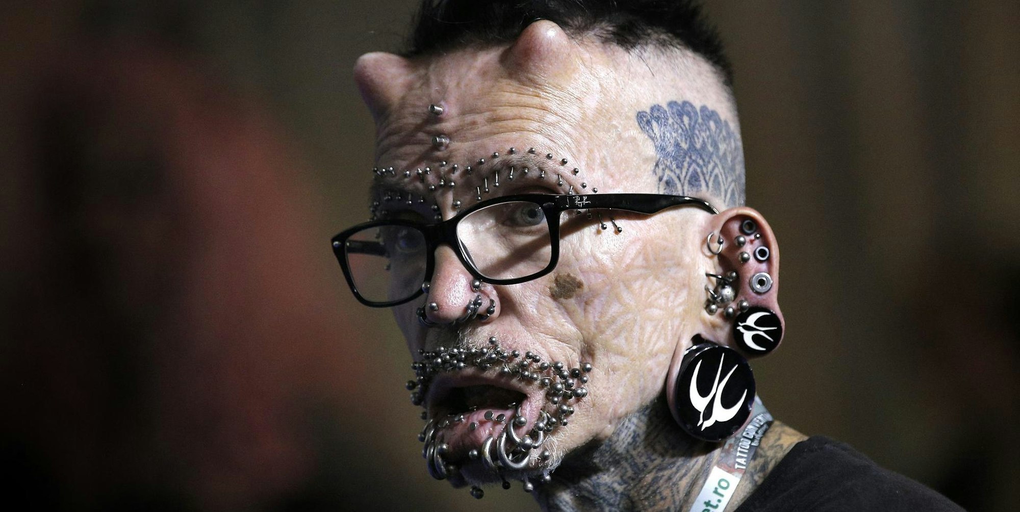 Mehr als 90 Metallteile sind über die Mundpartie des 58-Jährigen verteilt, da dürfte selbst ein kurzer Knutscher für Ungepiercte bereits ein Erlebnis sein.