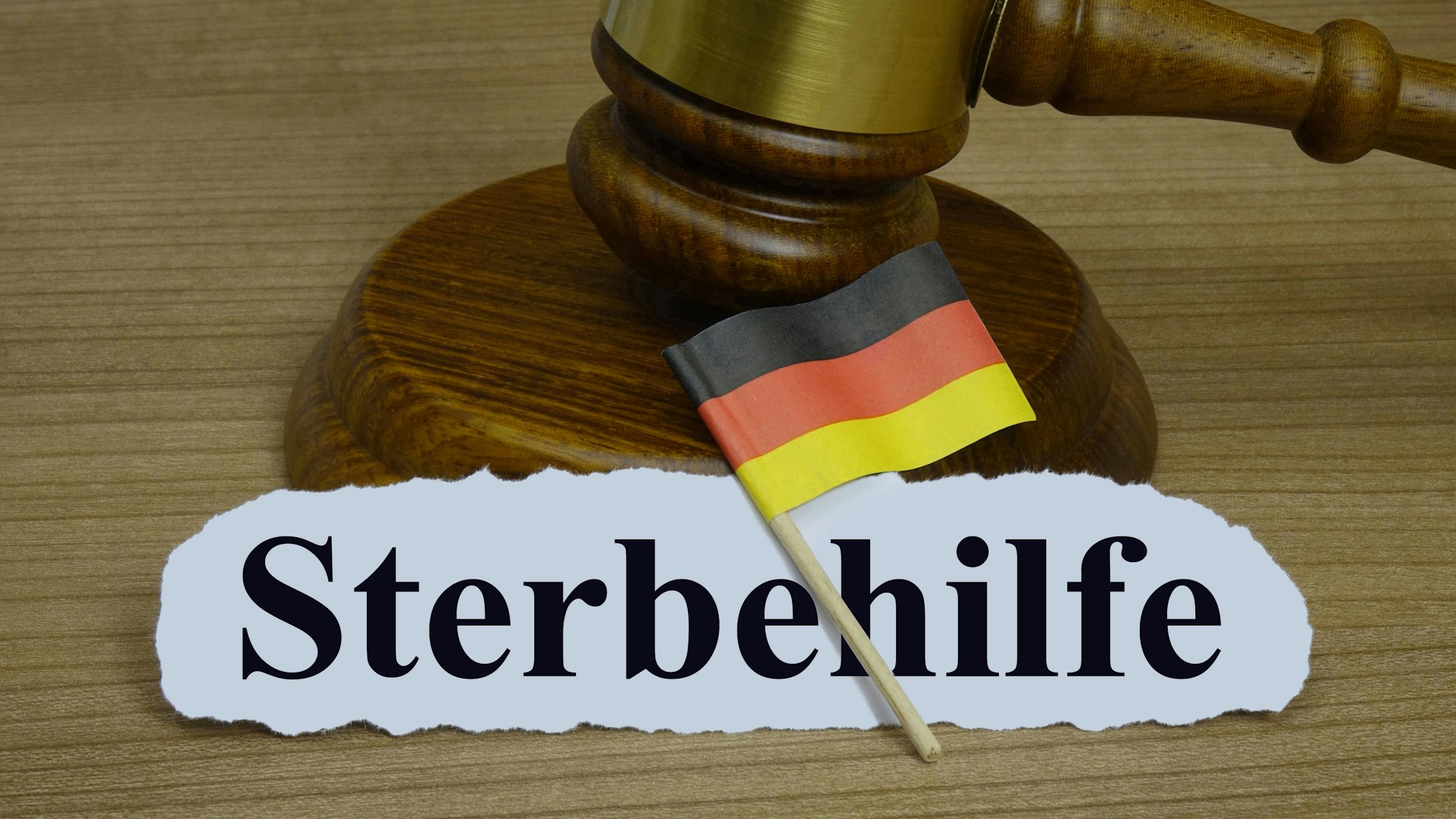 Gerichtshammer, Deutschlandfahne und Schriftzug „Sterbehilfe“