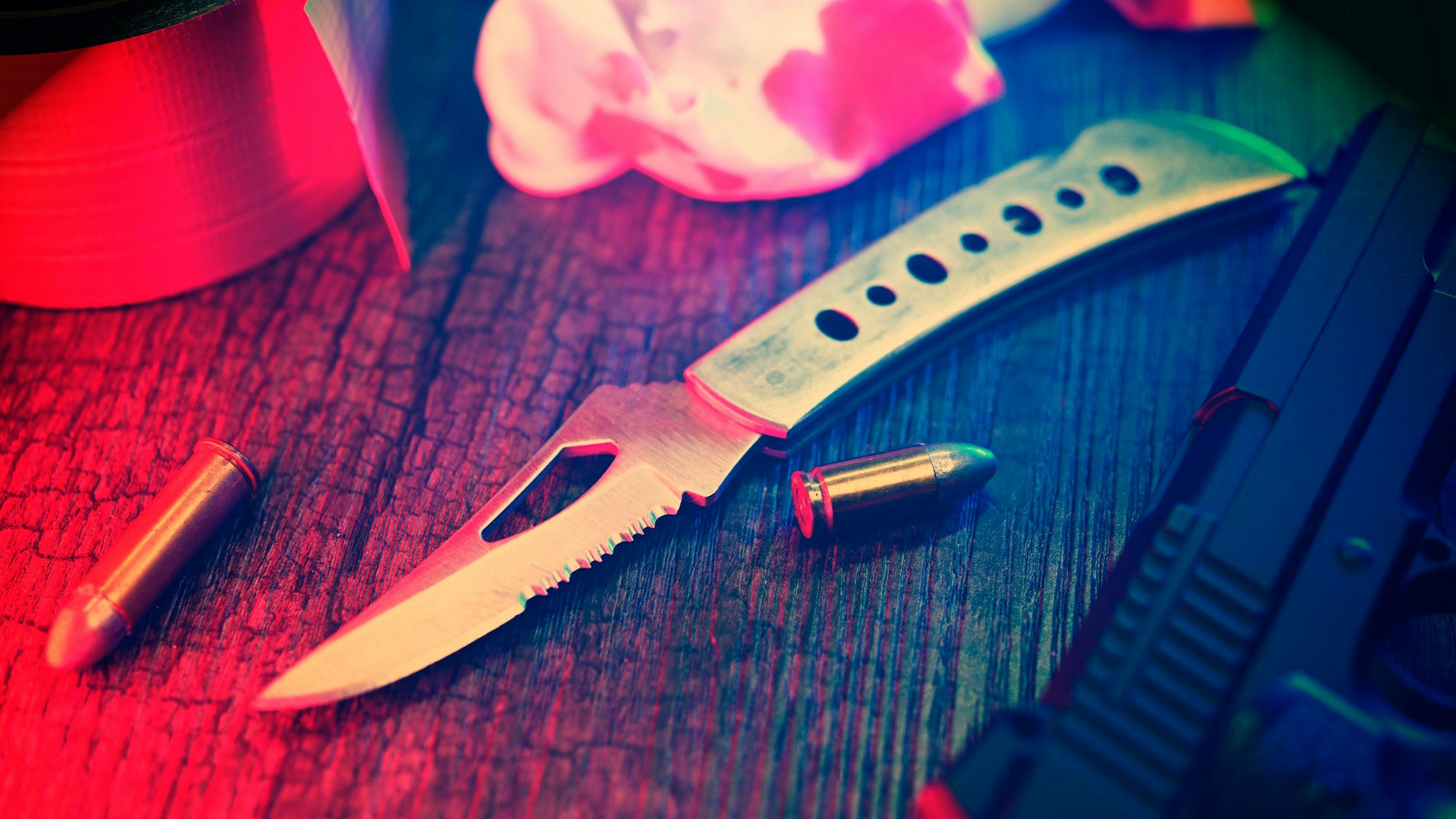 Messer, Munition, Waffe, Tuch und Klebeband.