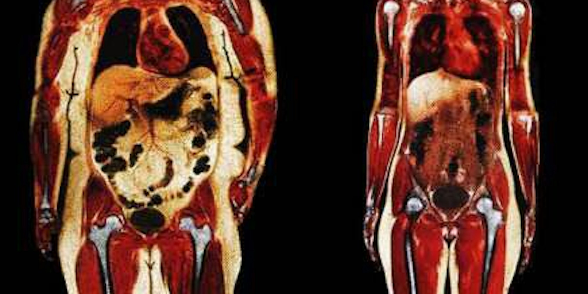 Prof. Jimmy Bell ließ eine normalgewichtige Frau und eine 111 Kilo schwere Patientin in einem speziellen Magnetresonanz-Tomografen (MRT) durchleuchten - und fand bei der dicken Testperson das Killer-Fett – im ganzen Körper verteilt, abgelagert an Organen.