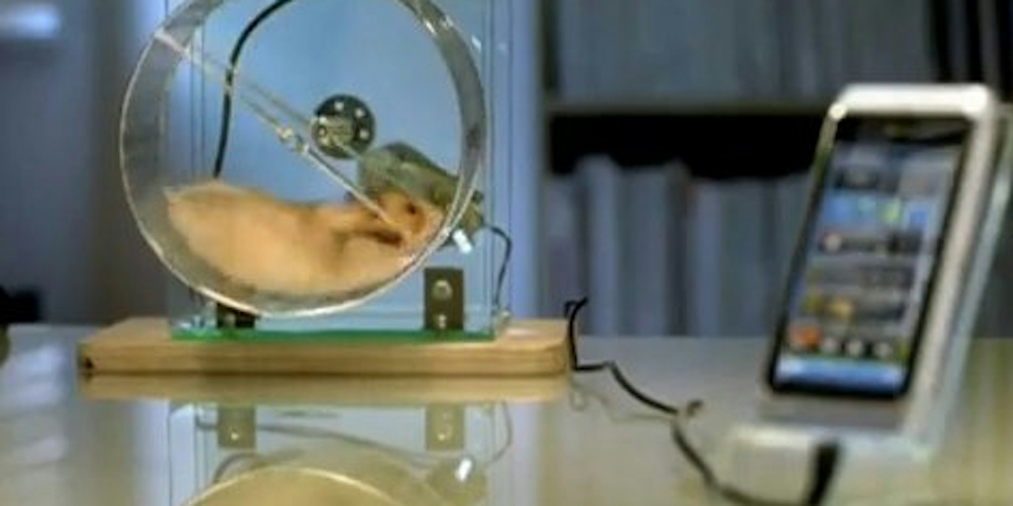 Selbstverständlich gibt es auch ein Beweis-Video von dieser Erfindung. Ob es sich dabei eher um virales Marketing eines Handy-Herstellers handelt, sei dahingestellt. Lustig ist es dennoch und nicht mal ganz abwegig. Zumindest solange der Hamster sein Lauftraining durchhält.