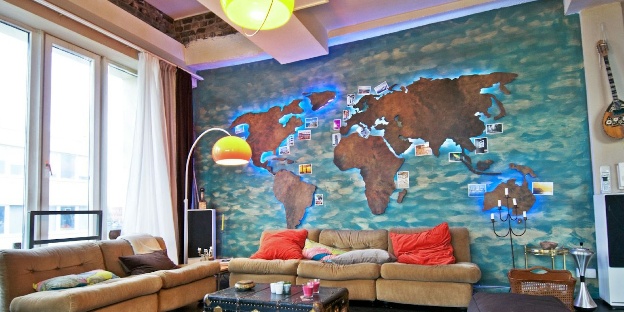 An der Wand eine riesige Weltkarte, ein alter Koffer als Couchtisch: So sieht's im Loft von Alex aus.