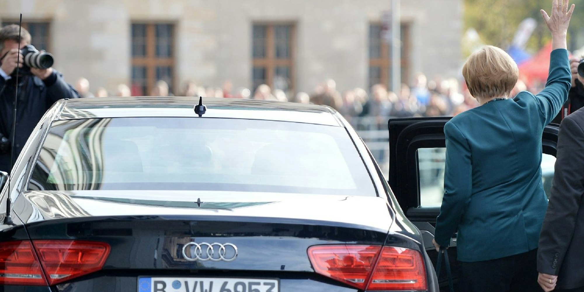 Auch Bundeskanzlerin Angela Merkel fährt mit Sonderschutzfahrzeugen. Hier steigt sie in einen Audi A8 L Security. Manchmal nutzt sie aber auch einen Mercedes S600 Guard oder einem BMW 760Li High Security.