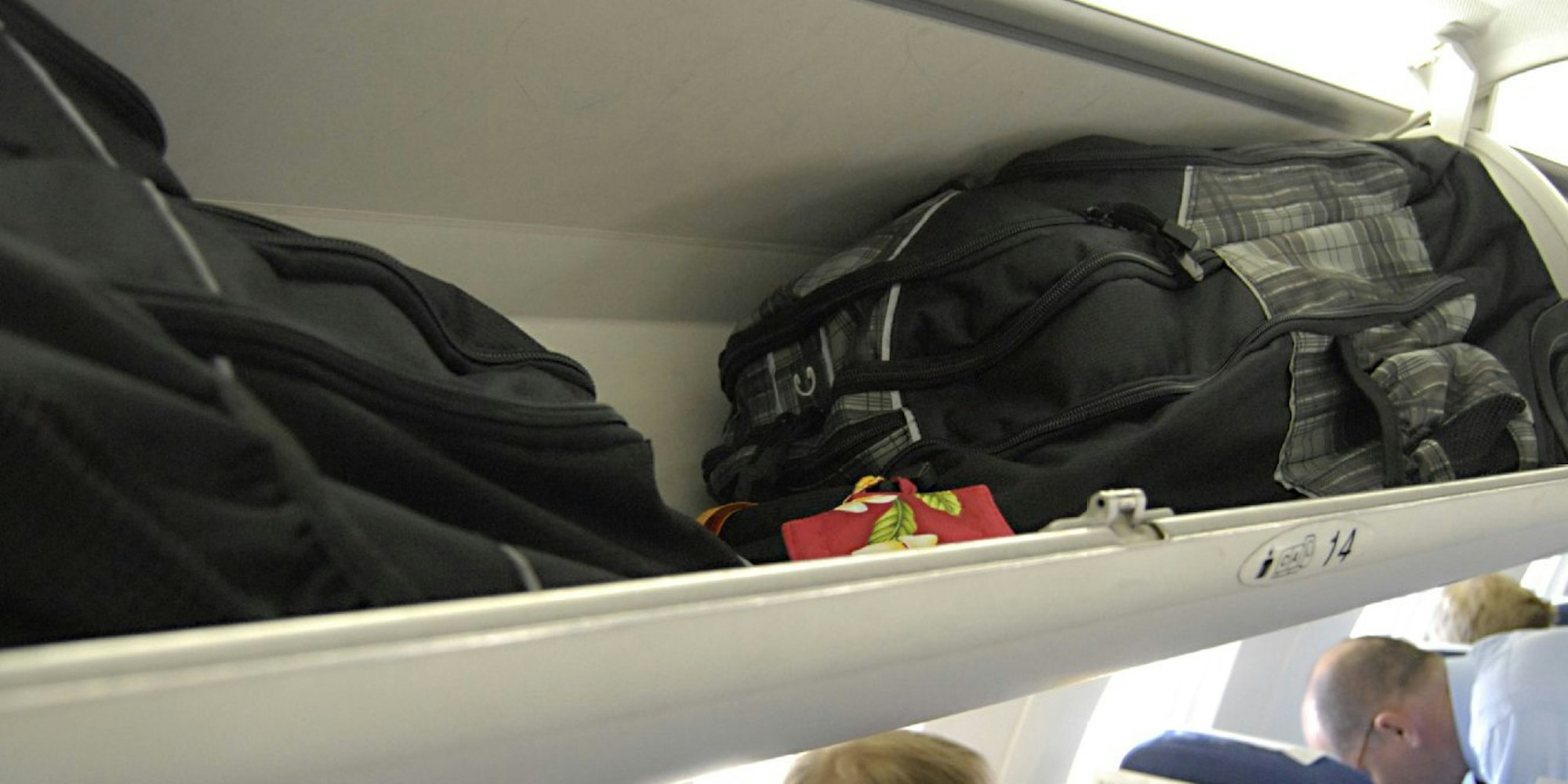 Damit das Handgepäck im Flugzeug nicht den Mittelgang versperrt, muss es sicher verstaut werden.