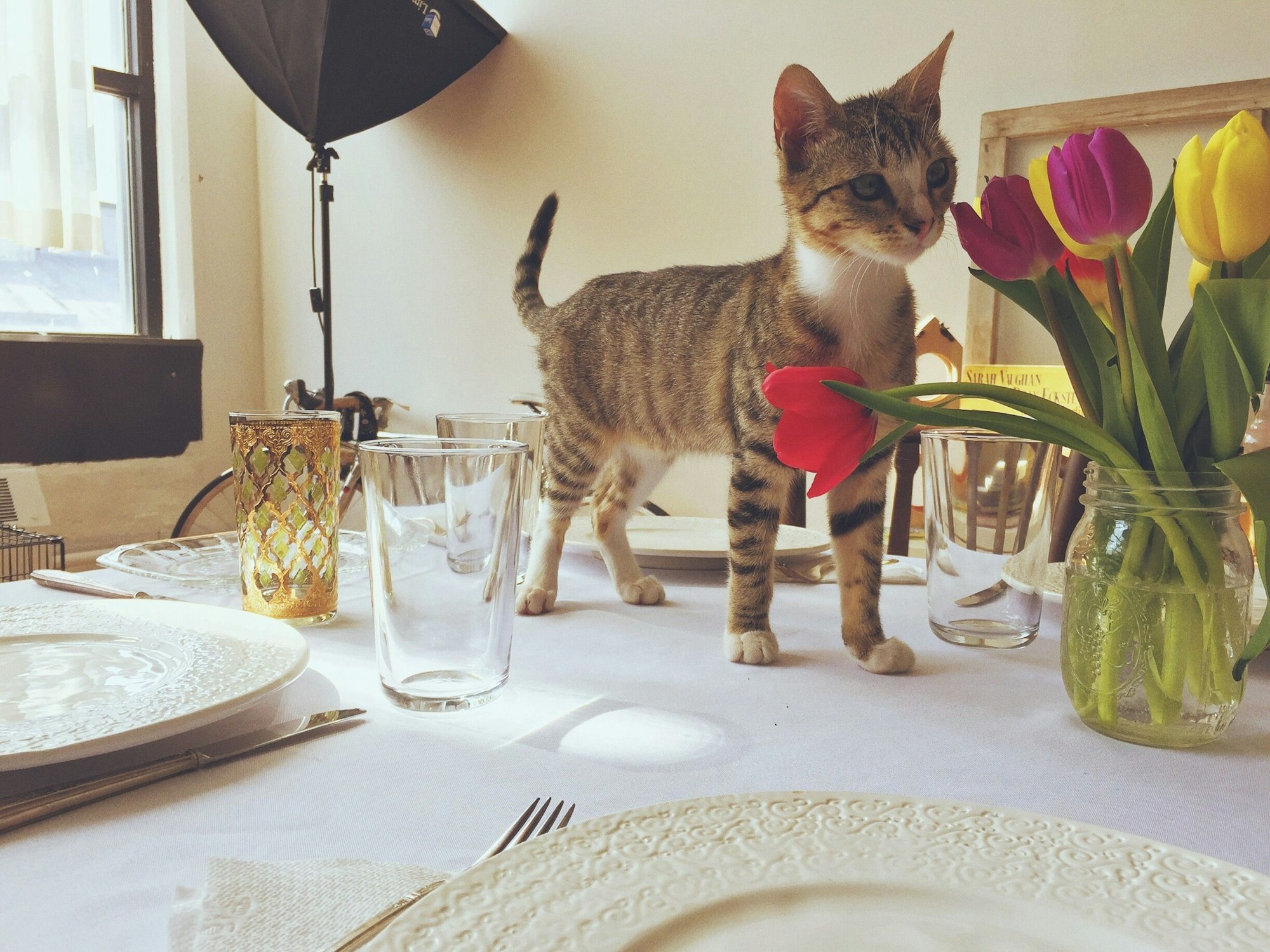 Finden Sie die Fehler! Zuerst einmal gehört die Katze (und sei sie noch so niedlich) nicht auf den Tisch. Zum Zweiten sollten Tulpen außerhalb der Reichweite von Tieren stehen, sie sind für diese nämlich schwach giftig. Und zum Dritten stehen die Tulpen in einer etwas zu niedrigen Vase. Obwohl das Einmachglas zugegebenermaßen hübsch aussieht.