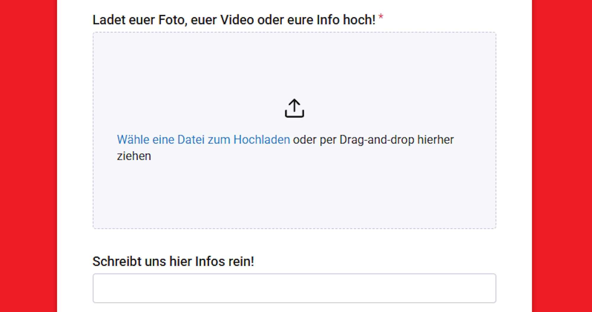 Über unsere Upload-Funktion habt ihr die Möglichkeit, Fotos, Videos oder kurze Infos hochzuladen.