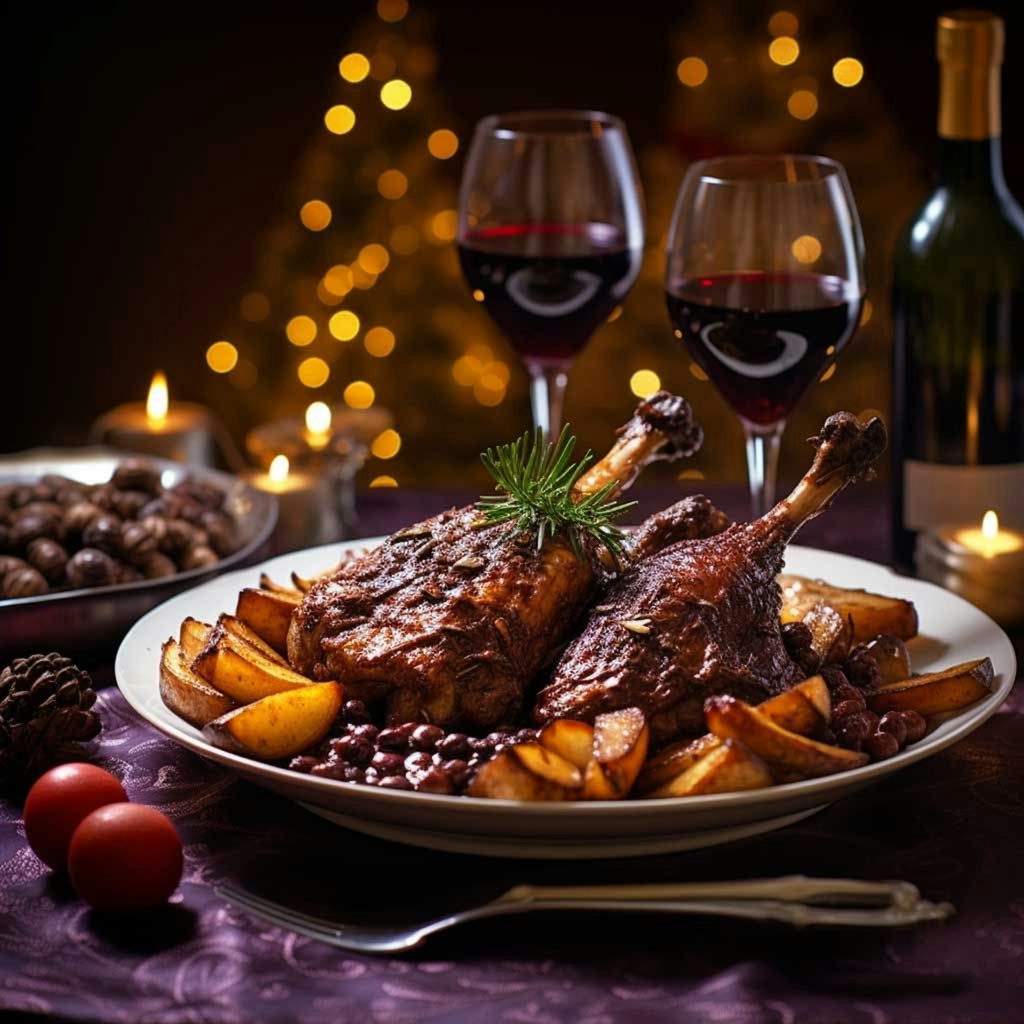 Tauche ein in den festlichen Zauber der Weihnachtsküche mit unserem unwiderstehlichen Rezept für geschmorte Gänsekeulen in Rotweinsoße mit Maronen, begleitet von köstlichen Kartoffelspalten.
