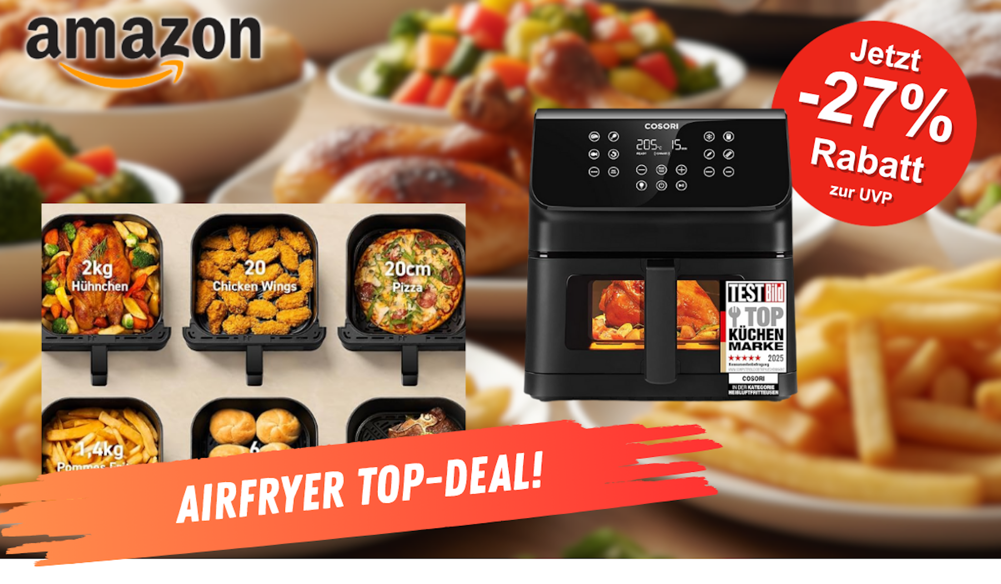 Du hast schon länger mit dem Gedanken gespielt, dir eine Heißluftfritteuse zuzulegen? Dann ist heute dein perfekter Tag! Der beliebte COSORI Airfryer mit 6,2 Litern Fassungsvermögen ist aktuell mit satten 27 % Rabatt erhältlich – aber nur heute und exklusiv für Prime-Mitglieder.