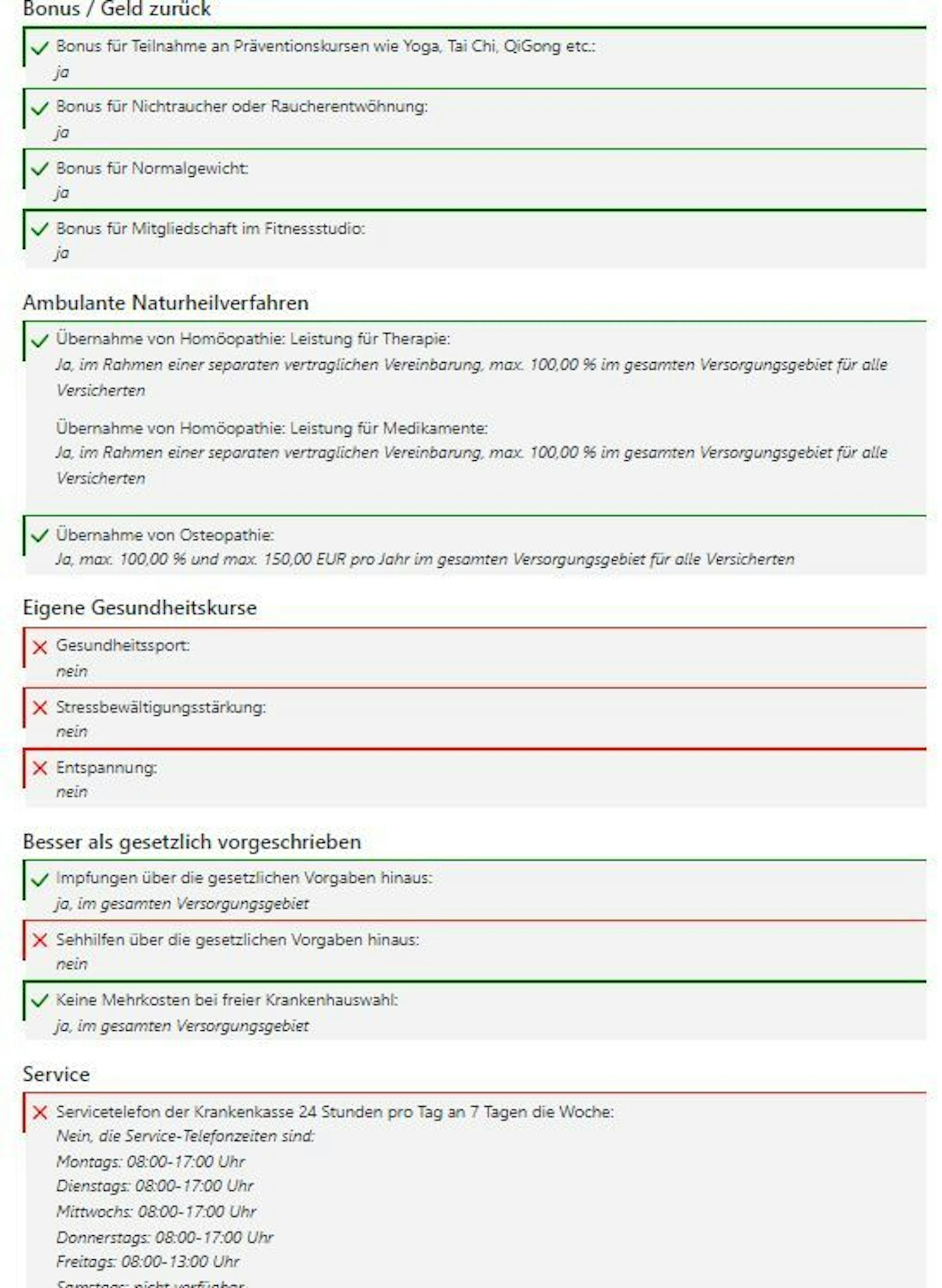 3. Nach deiner Filterung und mit direktem Klick auf eine für dich interessante gesetzliche Krankenkasse siehst du nochmal alle Leistungen aufgeführt: