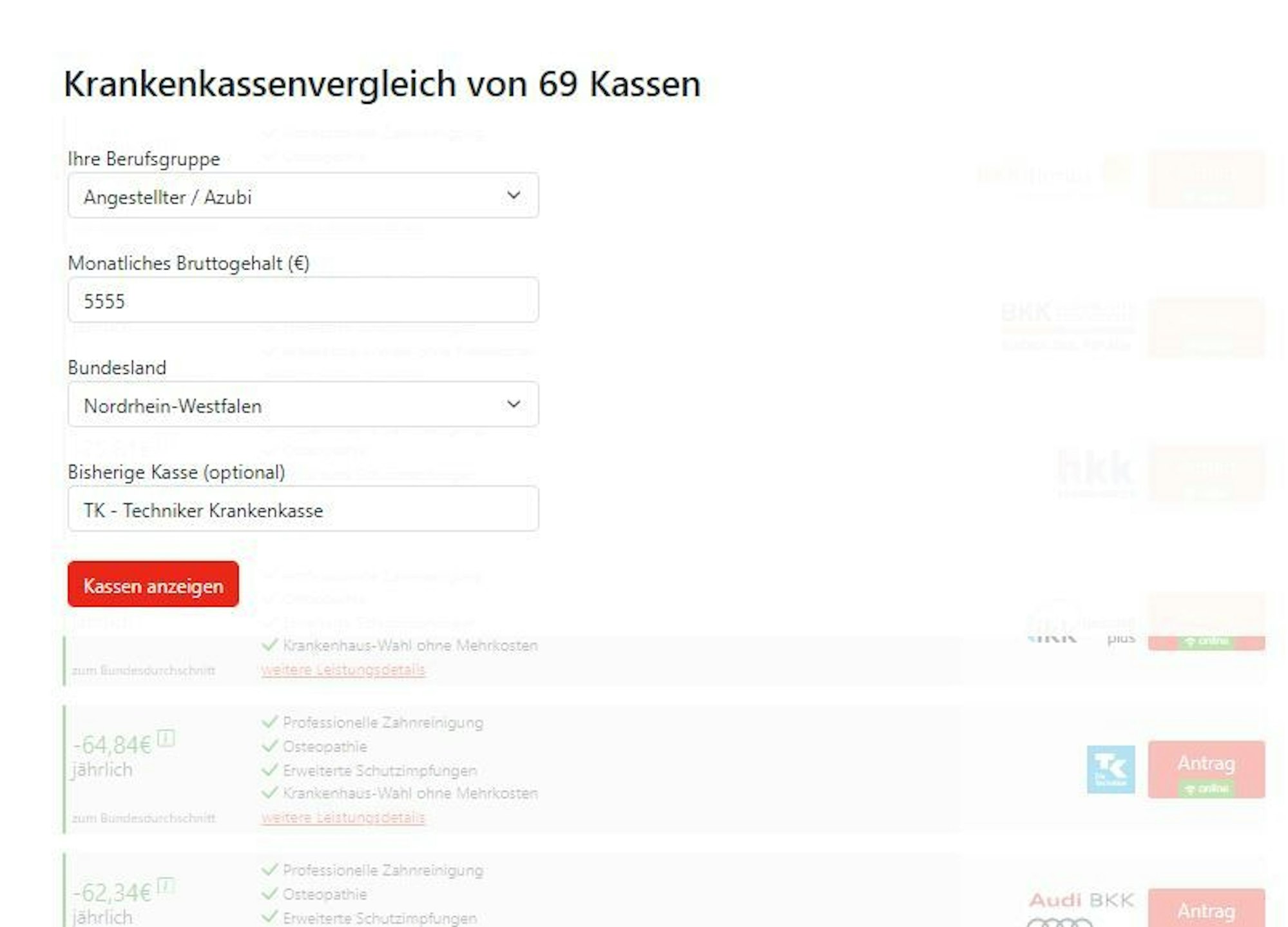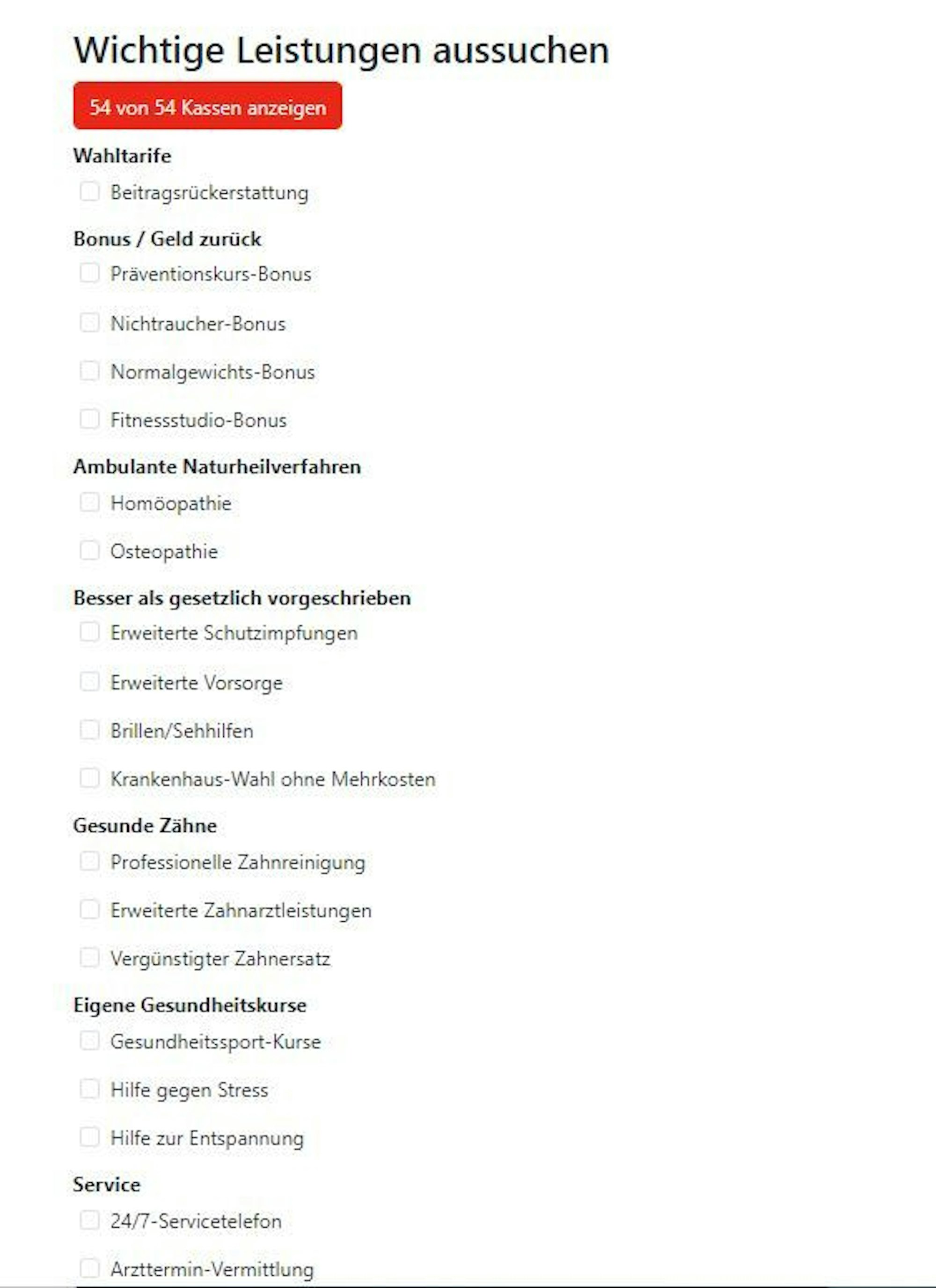 Hier kannst du für die wichtige Leistungen direkt auswählen, um deine gesetzliche Krankenkasse zu finden.