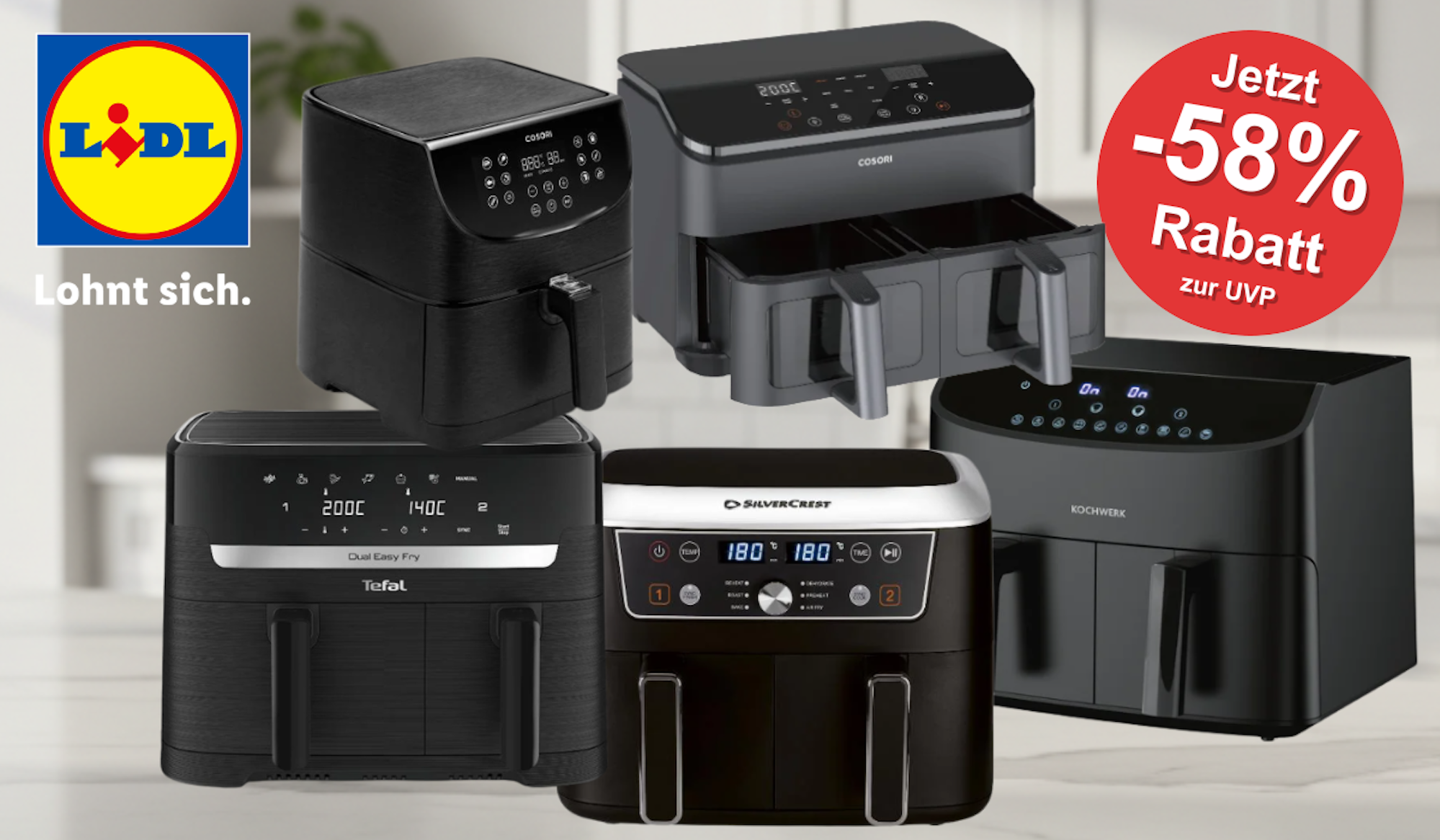 Mega Airfryer Lidl Sale mit bis zu 58% Preisnachlass - nur solange der Vorrat reicht.
