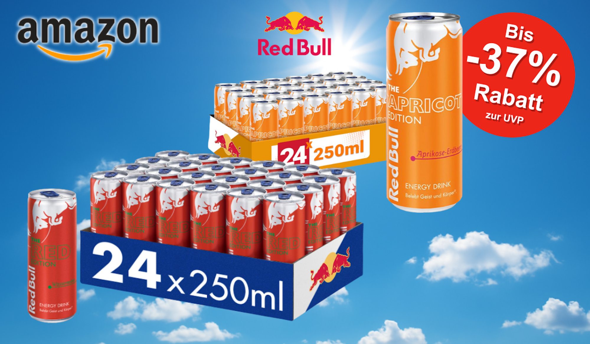 Aktuell gibt es auf Amazon ein unschlagbares Red Bull Angebot: Eine 24er Palette Red Bull in den Sorten Wassermelone und Apricot Edition mit satten bis zu 37% Rabatt. So sicherst du dir deinen Vorrat an Energy Drinks zum Bestpreis.
