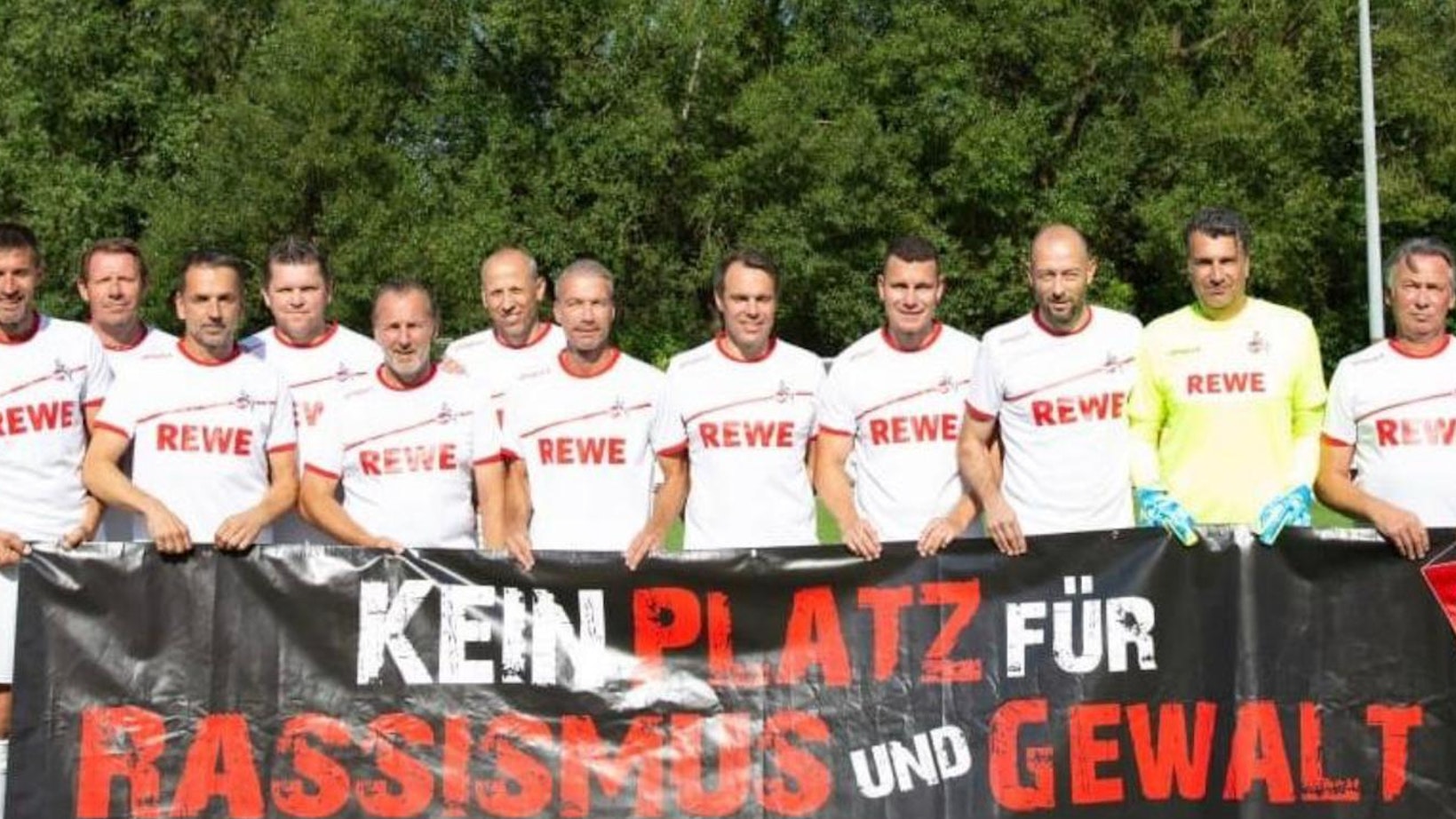 Die Traditionself des 1. FC Köln mit Stephan Engels (r.) und Torwart Pierre Esser gleich daneben.