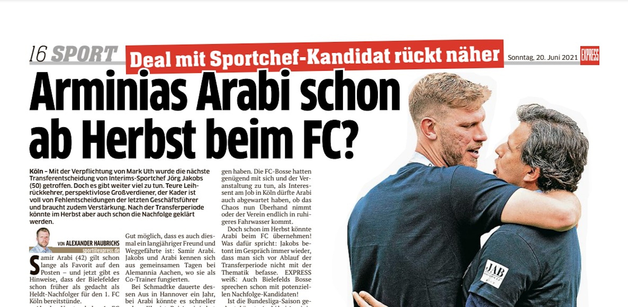 Bereits am 20. Juni wussten die EXPRESS-Leser-Bescheid: Arminia-Macher Samir Arabi steht vor einem Wechsel zum 1. FC Köln. Als EXPRESS.de kürzlich Interims-Sportchef Jörg Jakobs (50) zum Interview traf, machte der sich auch schon keine große Mühe mehr, die Spuren hin zu seinem früheren Weggefährten als Co-Trainer und Chef-Scout bei Alemannia Aachen zu verwischen.