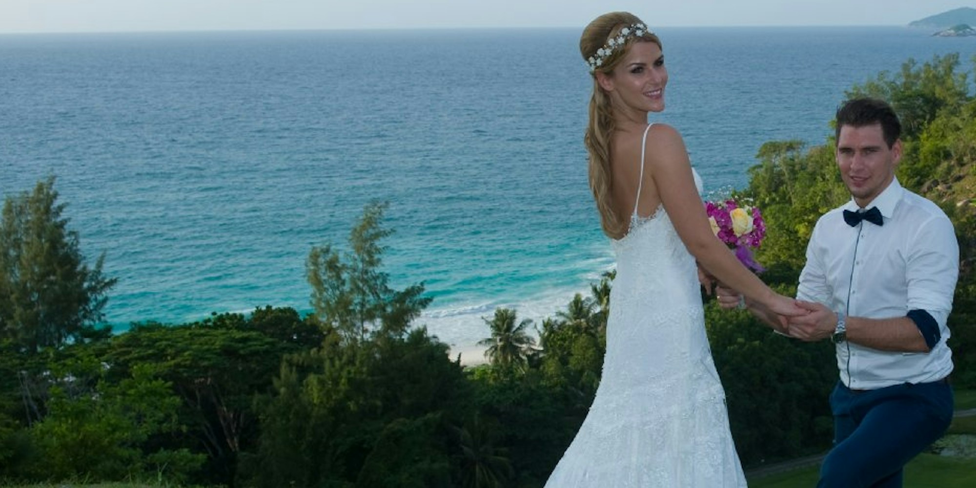Am 30. Dezember feierte der FC-Stürmer mit seiner hübschen Sarah Hochzeit auf den Seychellen - und seine Liebste strahlte in einem weißen Kleid und einem süßen Haarband aus Blumen - einfach nur wunderschön!