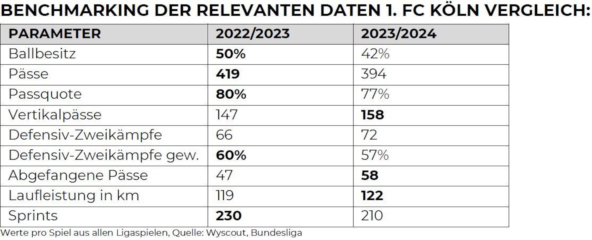 - Schwächere Zweikampfquote: Lag in der vergangenen Saison noch bei 60 Prozent, jetzt bei 57 Prozent. Durch die niedrigere Ballbesitzquote führt der FC nun aber mehr Defensiv-Zweikämpfe.