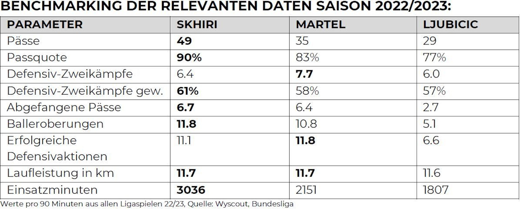 - Neue Rolle für Martel: Der U21-Nationalspieler fällt mit angepasster Spielweise auf der Sechs auf. So liegt sein Fokus nun mehr auf der Ballsicherheit, wodurch er weniger Vertikalpässe spielt (3,1 weniger), Martel hat dafür aber auch eine höhere Passquote (acht Prozent weniger Fehler). Neben Ljubicic sichert er mehr den Raum vor der Abwehr ab.