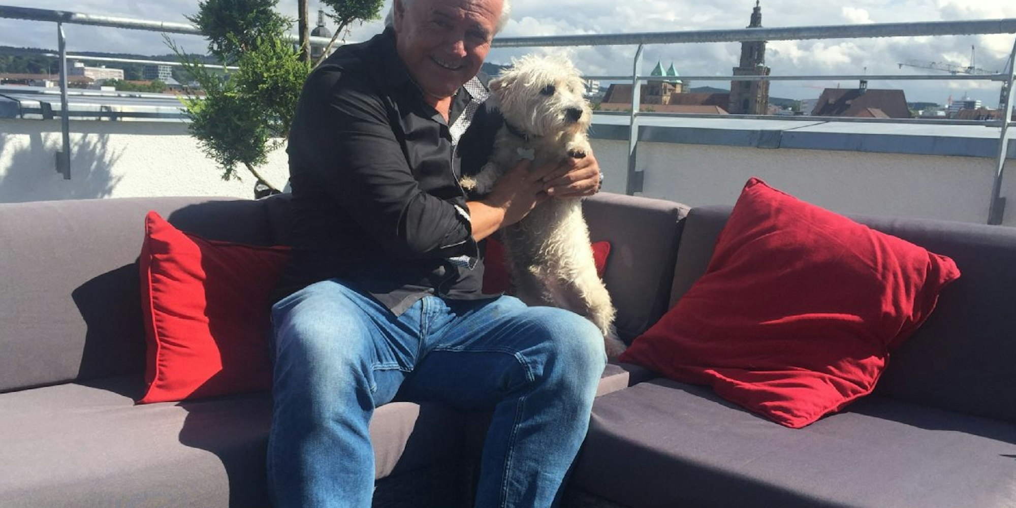 Uwe Rapolder auf seiner Dachterrasse in Heilbronn mit Hund Jimmy.
