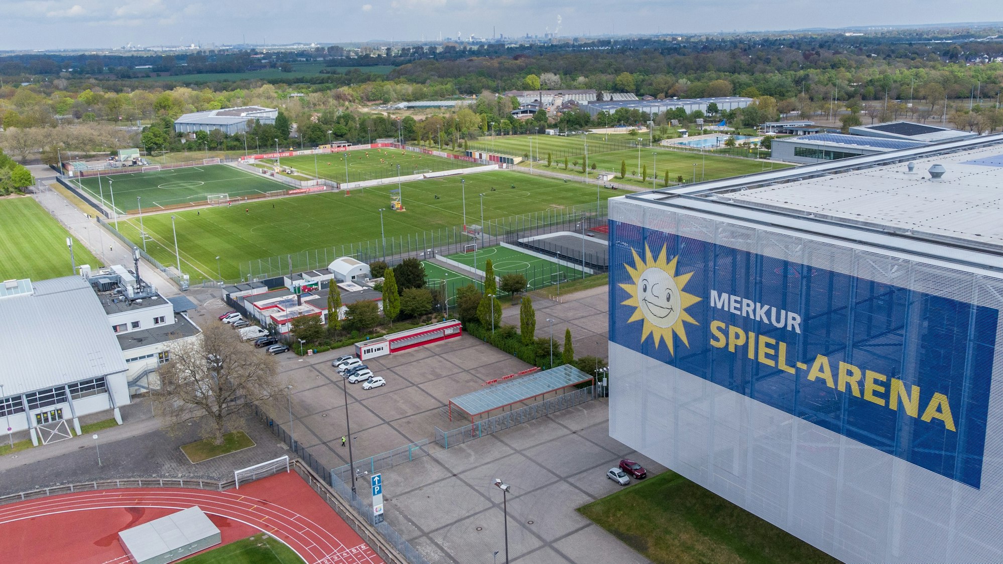 Der Arena-Sportpark in Düsseldorf-Stockum - mit Arena, Leichtathletikhalle (l.) und den Trainingsplätzen.