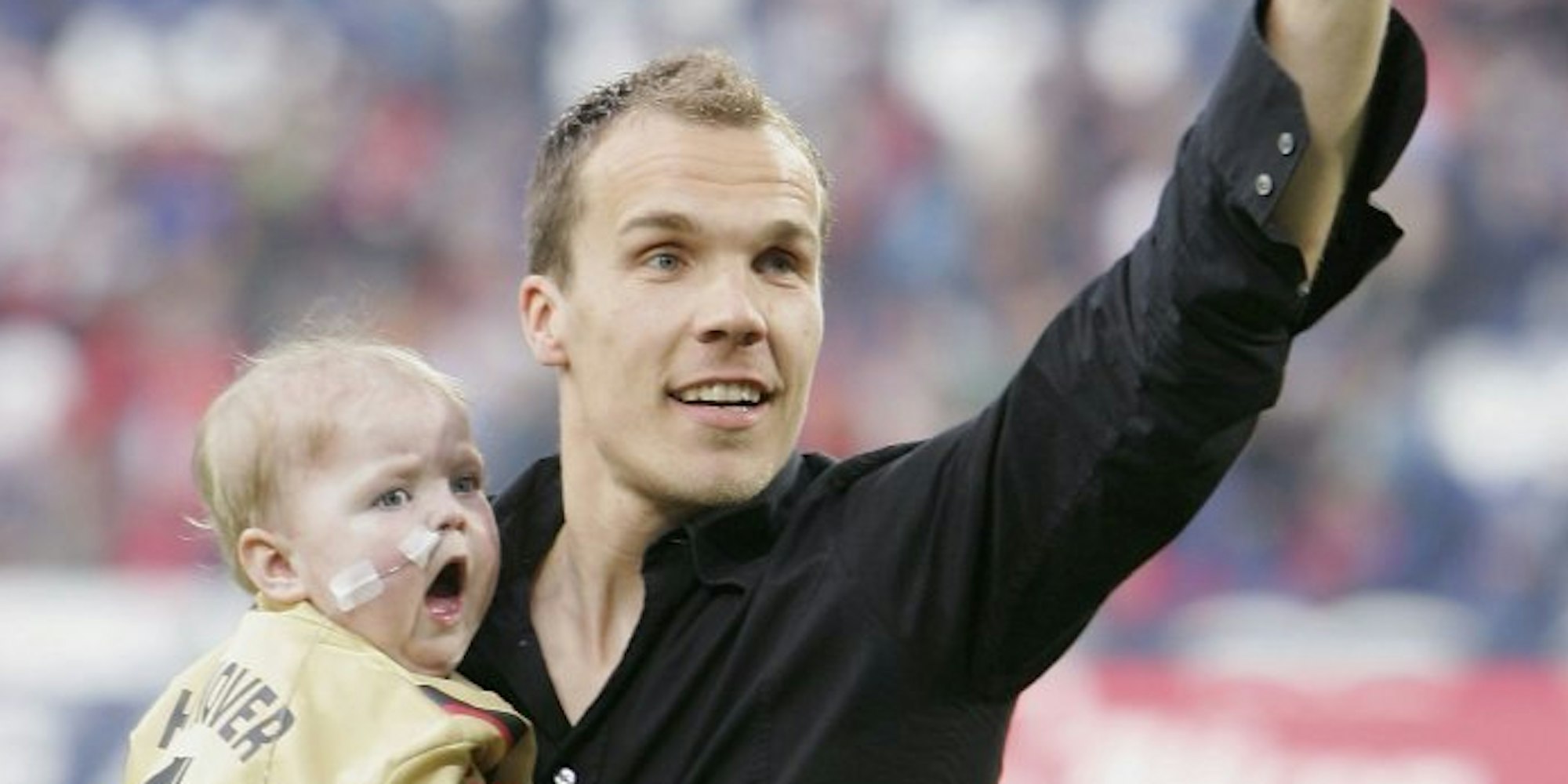 Robert Enke und seine geliebte Lara: Hier trägt er sie in Hannover über den Platz.