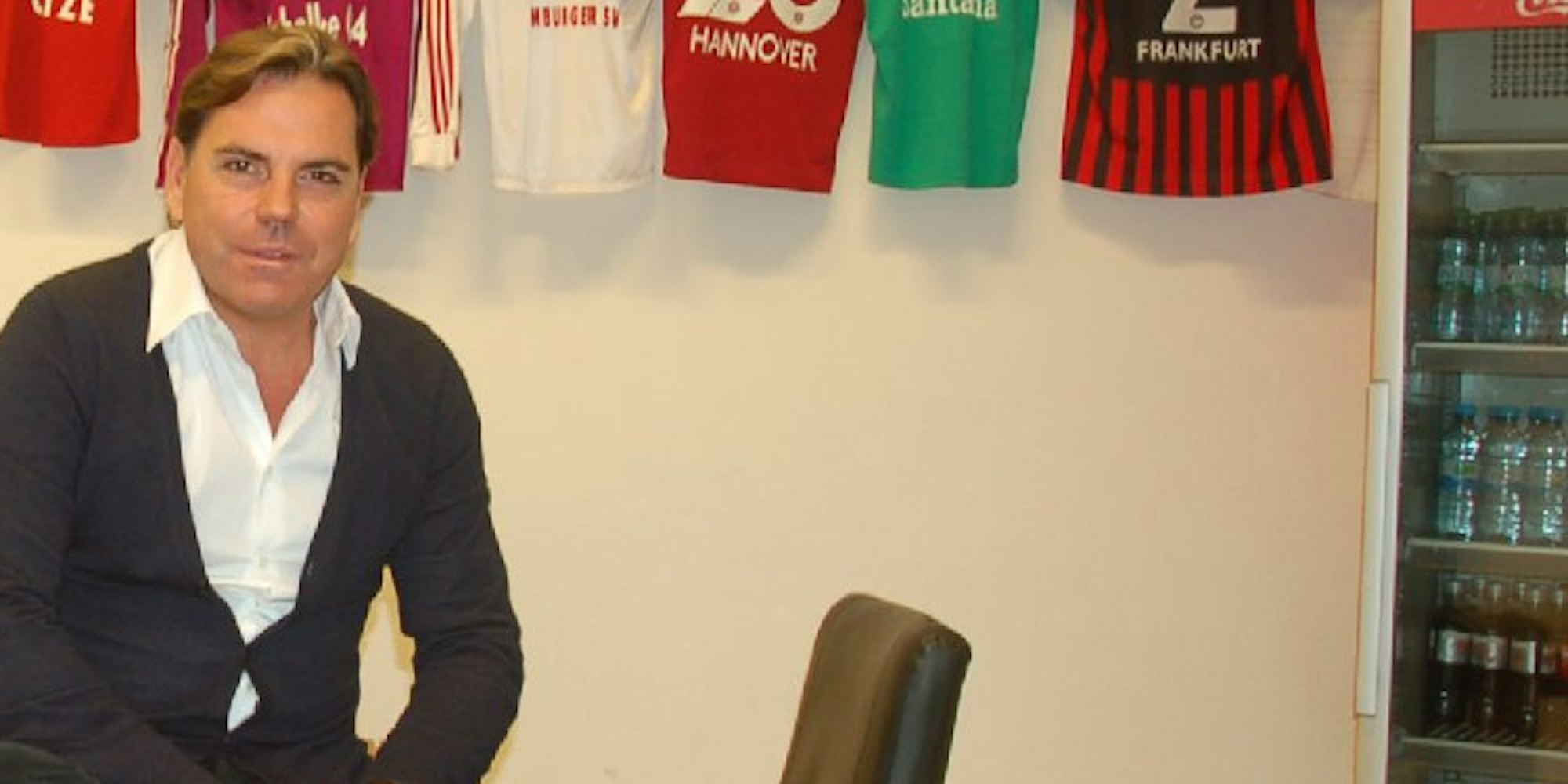 Volker Struth in seinem Büro: An diesem alten Eichentisch werden Karrieren gemacht und neue Ideen entwickelt. Dahinter baumeln die Trikots seiner Fußball-Stars.