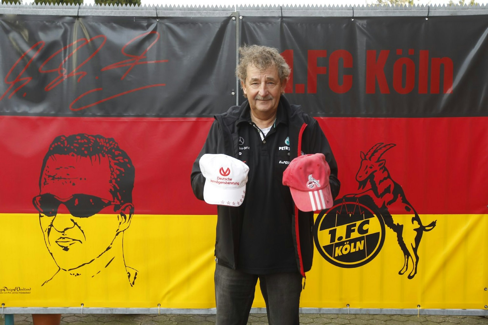 Fanclub-Vorsitzender Reiner Ferling steht vor seiner großen Deutschland-Fahne an seinem Haus: Er schwärmt für Michael Schumacher und den 1. FC Köln.
