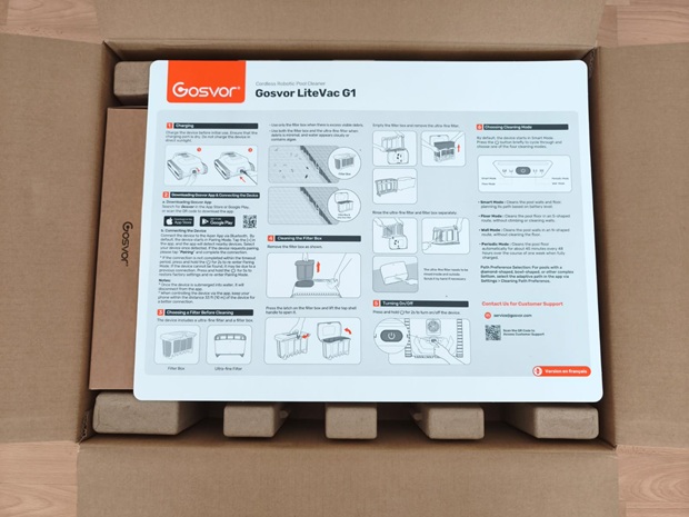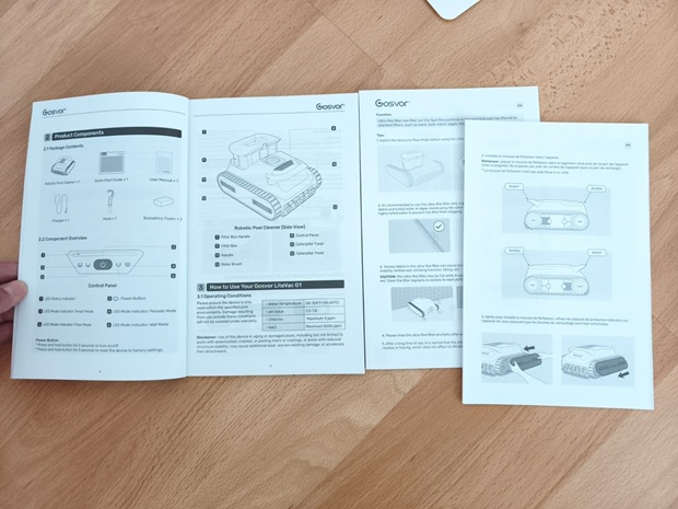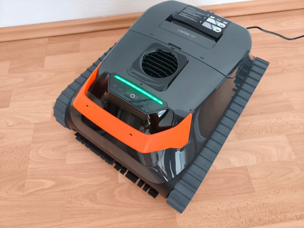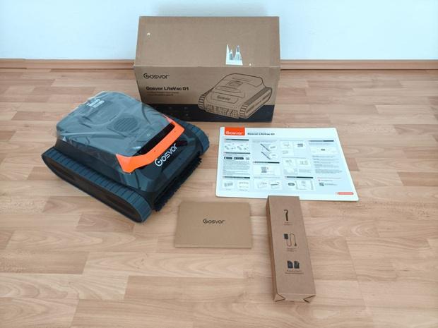 Beim Auspacken interessiert mich vor allem, ob das Gerät gegen Stöße sinnvoll geschützt ist und ob die Darstellung die spätere Wartung logisch vorbereitet. Der LiteVac G1 wirkt kompakt, hat eine breite Front, sichtbar integrierte Raupenketten, einen gut erreichbaren Zugang zur Filtereinheit und LED-Statusanzeigen. Die Anleitung fällt insgesamt eher kurz aus, was ich kritisch bewerte, weil Hinweise zu Material, idealen Einsatzbedingungen oder Grenzen bei Gefälle in der Praxis hilfreich sind. Für manche von euch kann eine knappe Dokumentation aber auch bedeuten, dass der Einstieg schneller geht, wenn ihr ohnehin ohne viel Lesen starten wollt.