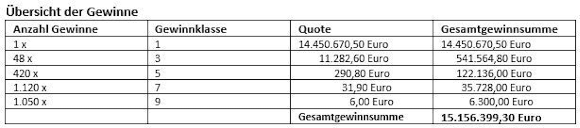 Bei der Ziehung von LOTTO 6aus49 (11. Mai) konnte mit einem System-Anteilsschein „Chancen Booster“ von WestLotto der Jackpot geknackt werden. Zu der Gewinnsumme von 14,5 Millionen Euro aus dem ersten Rang kommen noch weitere Gewinne aus weiteren Klassen hinzu. Somit ergibt sich eine Gesamtgewinnsumme von 15.156.399,30 Euro.