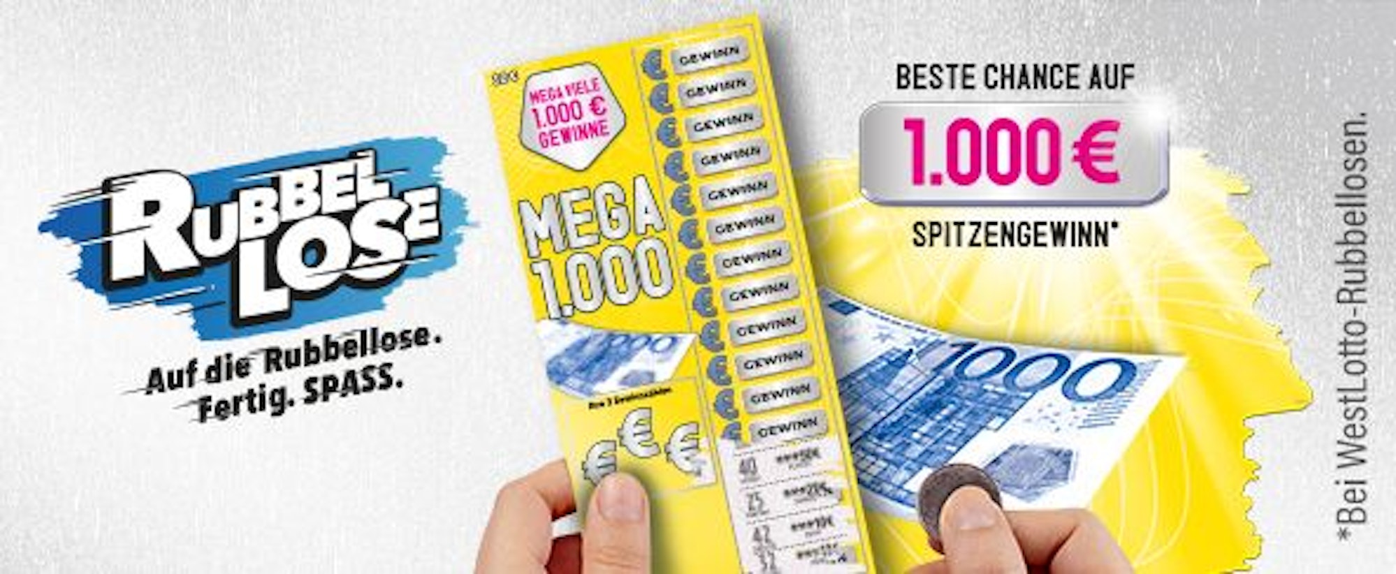 Die 1.000 wird oft dafür verwendet, wenn betont werden soll, dass etwas besonders groß ist oder oft vorkommt. In dieses Bild passt auch das neue Rubbellos MEGA 1.000 von WestLotto, dass einen Spitzengewinn in Höhe von 1.000 Euro bietet. Im Vergleich zu anderen WestLotto-Rubbellosen gibt es damit besonders viele und zudem die beste Chance auf 1.000 Euro-Beträge (Chance 1:1.000).