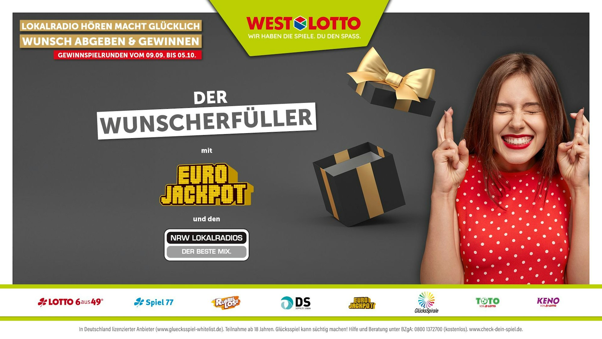 Mehr auf westlotto.de, bei allen NRW-Lokalradios und unter Tel: 0180-5080580 (dt. Festnetz 14 Ct/min – Mobil max. 42 Ct/min).