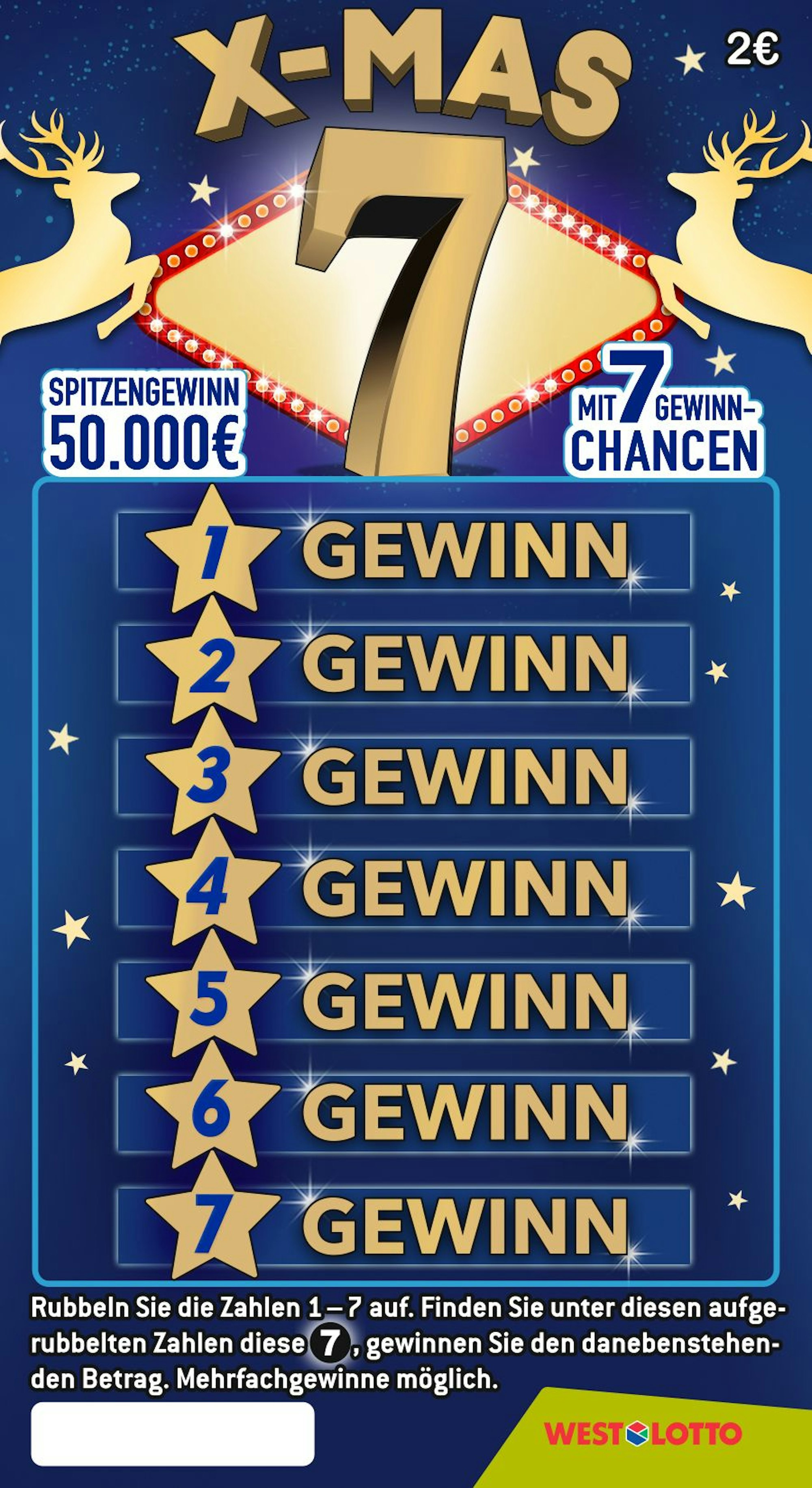 Rubbeln Sie die Felder 1-7 auf. Finden Sie hier eine 7 unter der Rubbelfläche, gewinnen Sie den danebenstehenden Betrag. Sieben Chancen auf einem Los, auch Mehrfachgewinne sind möglich.Preis: 2 EuroSpitzengewinn: 50.000 Euro (Chance 1:1,9 Mio.)